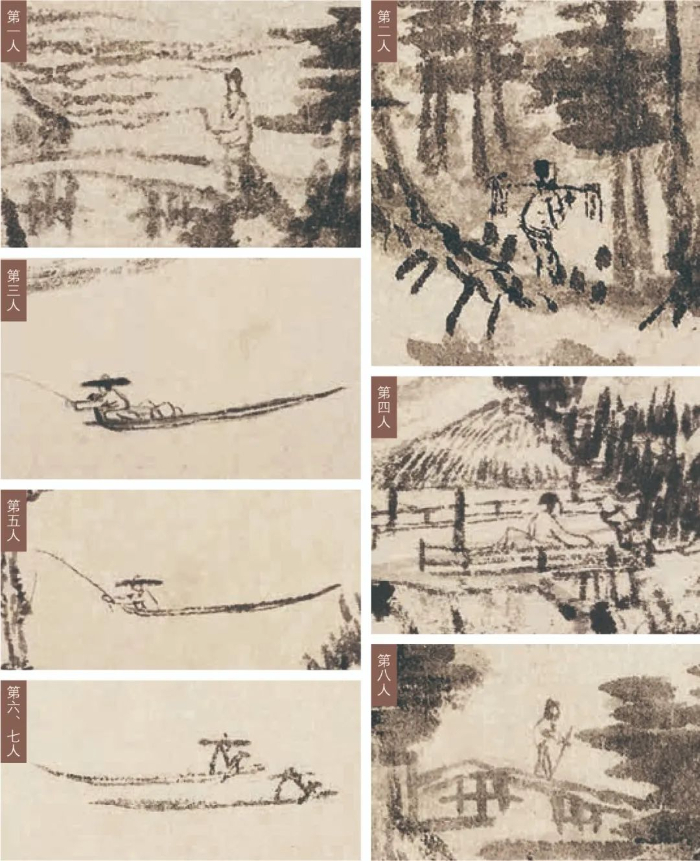 說第九位人物之前,我們先來看看上圖展示的已經(jīng)形成共識的八位人物。從形象上看,這八位人物大概為高士、樵夫和漁父。詳細(xì)解讀這八位人物之前,我們不妨先一起找尋一下隱藏的第九位神秘人物。