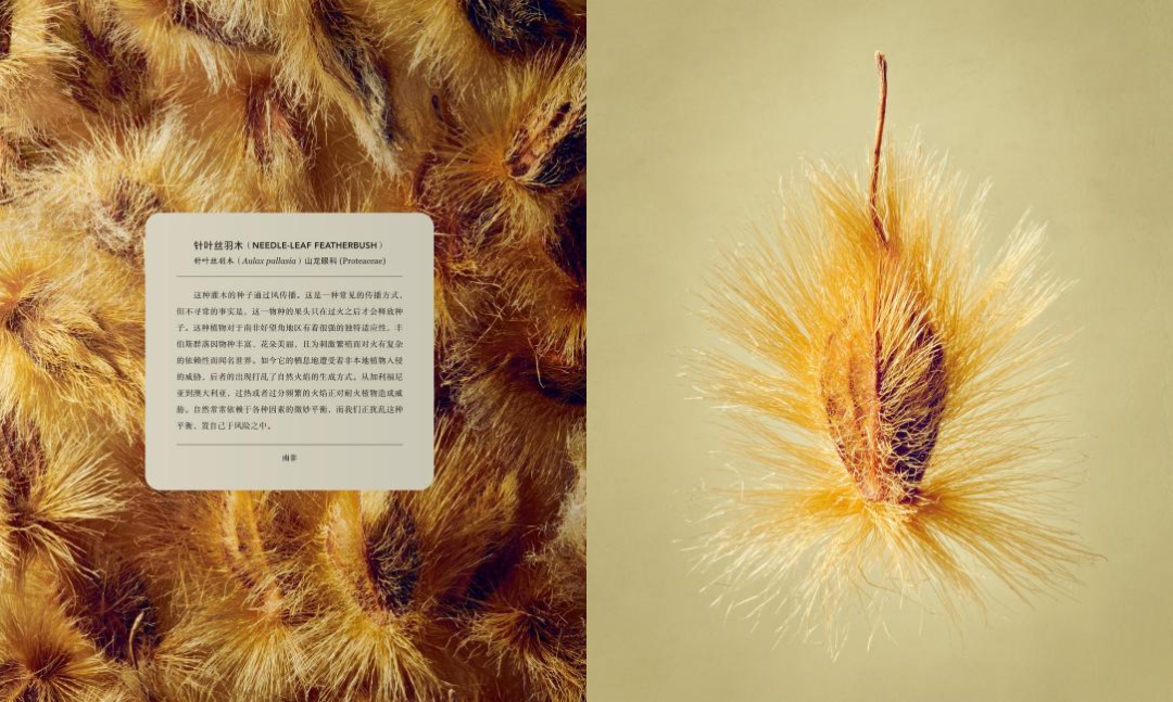 隨后,植物園耗時6個月,從3500份標(biāo)本中精心篩選出100種植物果實與種子。列文·比斯將這些攝影對象放大至80倍,捕捉到植物表面豐富多樣的細(xì)節(jié),照片的精細(xì)程度超乎想象。每張圖片還配有一段簡潔的科普文字,不僅反映了100多年來植物的采集狀況,展示了種子的傳播方式,還介紹了人類對植物材料的利用方法。