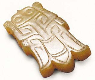甘肅武威磨嘴子漢墓出土的一件玉蟬,長6.4厘米,寬3.1厘米,厚0.8厘米。青白玉,圓雕。腹平、背凸。玉蟬頭中部凸起,下有穿孔用于系掛。雙面用陰線雕刻出蟬的雙目、雙翼、腹、尾等輪廓。玉質晶瑩,造型逼真,為佩玉。武威雷臺漢墓出土的一件玉帶鉤,長10厘米,寬1.5厘米,厚2.7厘米。質地為青玉,用淺浮雕刻出。鉤首呈龍頭形,高而窄,鉤肚圓鼓,背有一圓鈕。當是貴官豪強的用物。
