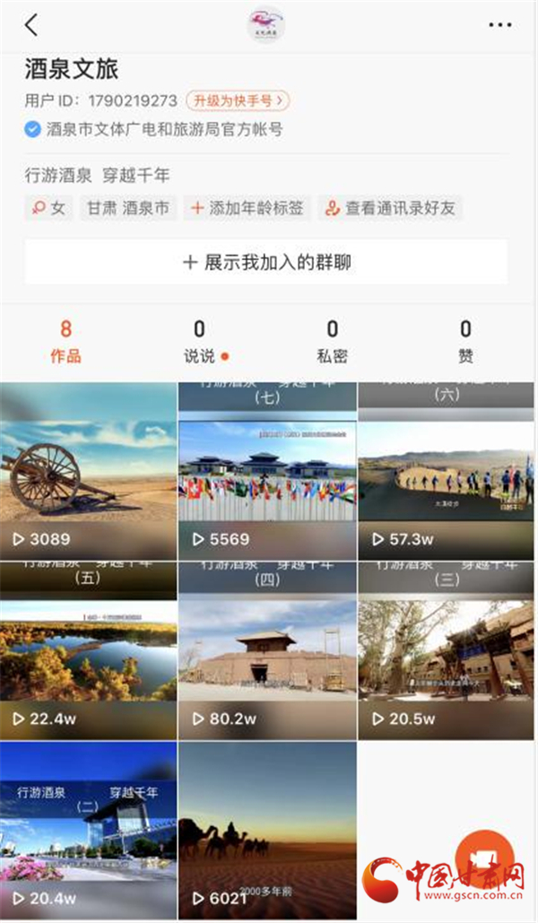 收到通知后,酒泉市文體廣電和旅游局按照省文旅廳要求,迅速開通“酒泉文旅”快手官方賬號,申請注冊了縣(市、區(qū))文旅局、4A級以上景區(qū)、縣(市、區(qū))博物館21家快手大V官方政務號,推薦上報33位熟悉網(wǎng)絡傳播規(guī)律、形象素質較好的導游、講解員快手大V,組織建立了酒泉文旅快手大V培養(yǎng)隊伍。組織參加省文旅廳開展的線上“甘肅文旅快手大V培訓”,讓更多的景區(qū)景點和博物館的導游、講解員參與其中,把快手平臺作為網(wǎng)絡宣傳主陣地,積極對外宣傳推介酒泉豐富的文化旅游資源。