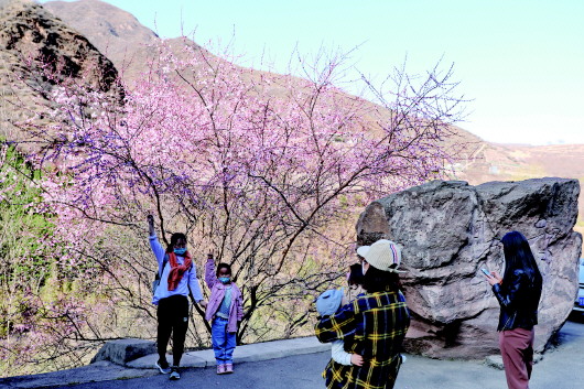 3月22日,游客在崆峒后峽賞花拍照。記者 姚志強(qiáng) 攝