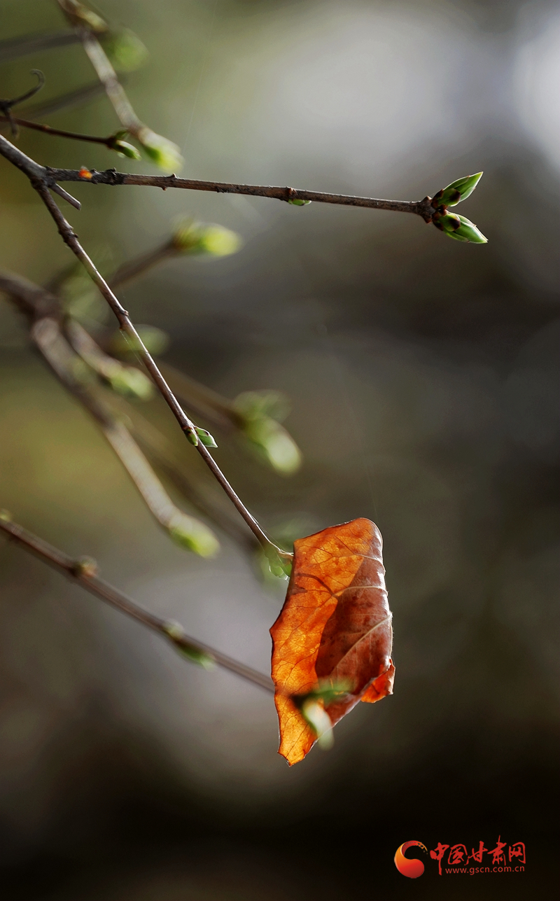 春意萌動(dòng),新綠始發(fā),一片枯葉尚未落下,新的生命已經(jīng)悄然萌發(fā)。