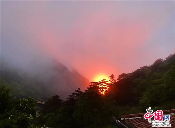 每逢五月,杜鵑花如約而至,用思慮了一冬的巧思把黃山的每一個(gè)角落都裝扮一新,給連綿不絕的山崗披上了五彩的織錦。經(jīng)過了一冬的蟄伏和等待,杜鵑鉚足了勁兒,花團(tuán)錦簇的熱情如“燃”起的火把,紅透了半邊天。黛青色的遠(yuǎn)山縹緲幽遠(yuǎn),參天的松柏枝繁葉茂,淡而薄的云霧似有還無(wú),杜鵑的姹紫嫣紅給黃山這幅意蘊(yùn)悠長(zhǎng)的水墨畫增添了幾分濃墨重彩,黃山更加靈動(dòng)秀美了。最壯觀的當(dāng)屬日出日落時(shí)分了,天邊的紅霞好似在花枝間流連,墜入花叢般和散落一地的杜鵑相互輝映、渾然一體。