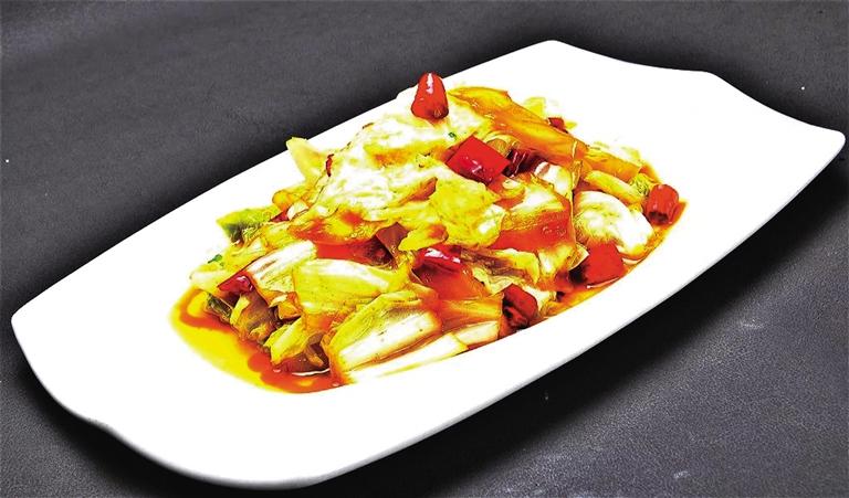 酸辣白菜的食材要選上等的大白菜,剝去外層老葉當主料。老姜去皮,優(yōu)質紅朝天椒泡軟,川椒過熱水,以白糖、米醋、味精、香油等為輔料。先把白菜切細條,放入微量鹽,拌勻腌制四五個小時后,在涼開水中過一下,撈出控水,放至微蔫。這時,起炒鍋開火,冷油放入辣椒、花椒、蔥絲、姜絲,慢慢煎至微微發(fā)黃散出香味時,將油潑在白菜上,最后放入白糖、米醋、味精等拌勻,就大功告成了。