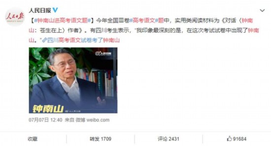 不過,他沒想到,今年全國Ⅲ卷高考語文題中,實(shí)用類閱讀材料為《對(duì)話〈鐘南山:蒼生在上〉作者》。有四川考生表示,“我印象最深刻的是,在這次考試試卷中出現(xiàn)了鐘南山。”