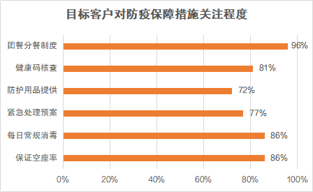 在旅游運營商選擇方面,區(qū)別于以往的“先看價格,再看服務(wù)”,客戶更關(guān)注“是否提供防疫保障,能否有效落實”。九成以上客戶表示,旅游過程中團餐應(yīng)嚴(yán)格采用分餐制度,最大化保障用餐安全;八成以上客戶認(rèn)為,需要嚴(yán)控旅游大巴空座率、做好日常消毒工作。
