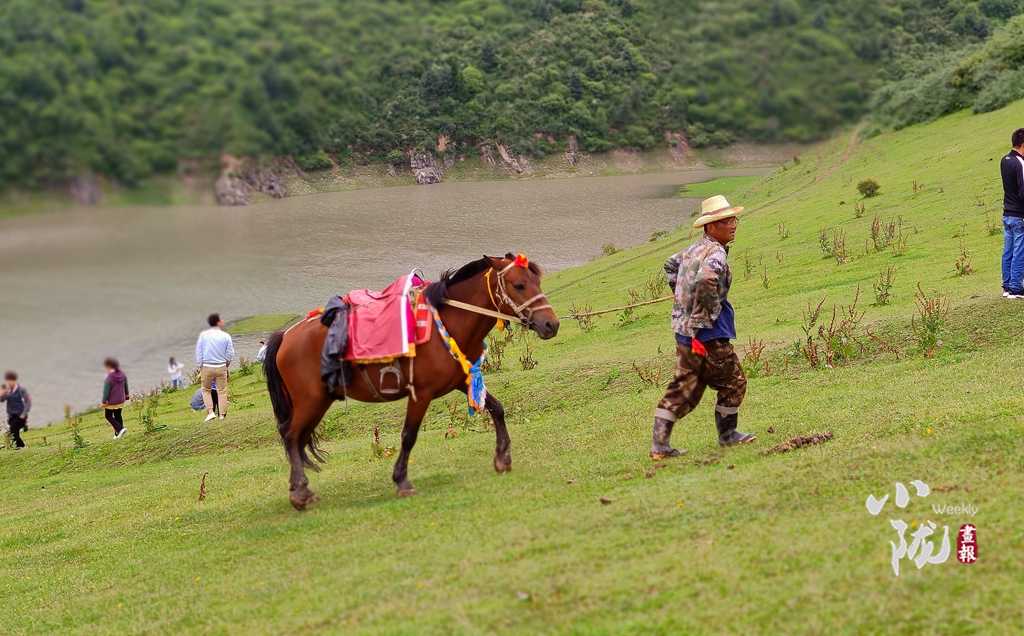 湖的東西兩側聳立著廟花山和臨潭最高峰白石山,環(huán)湖山坡芳草萋萋,水映山廓,山水云天渾然一體。