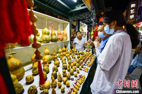 圖為游客購(gòu)買(mǎi)刻葫蘆工藝品?!⊥醣筱y 攝