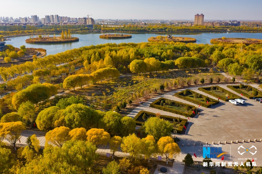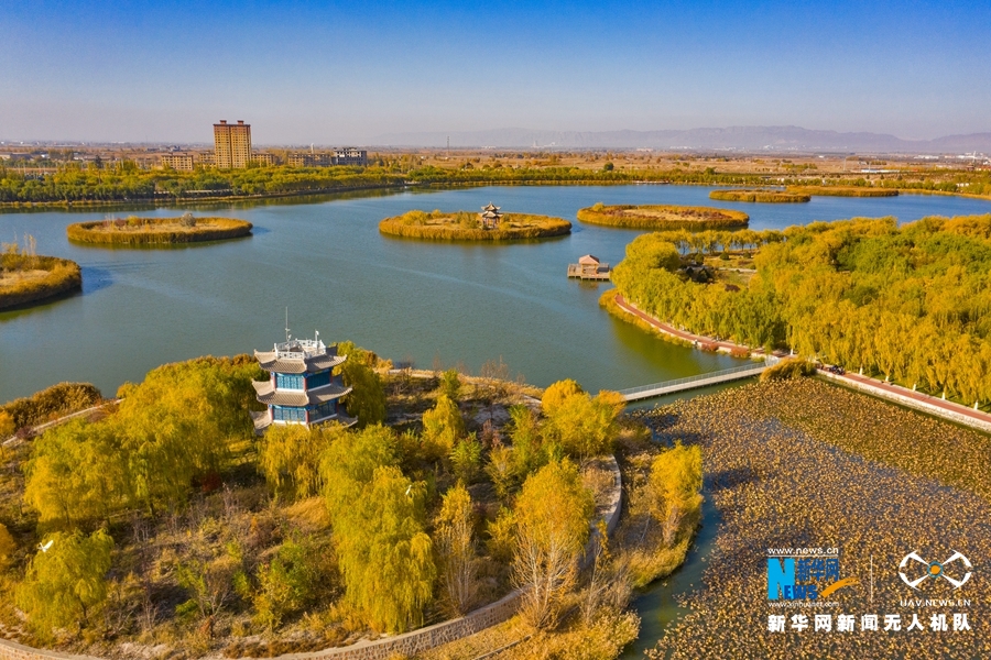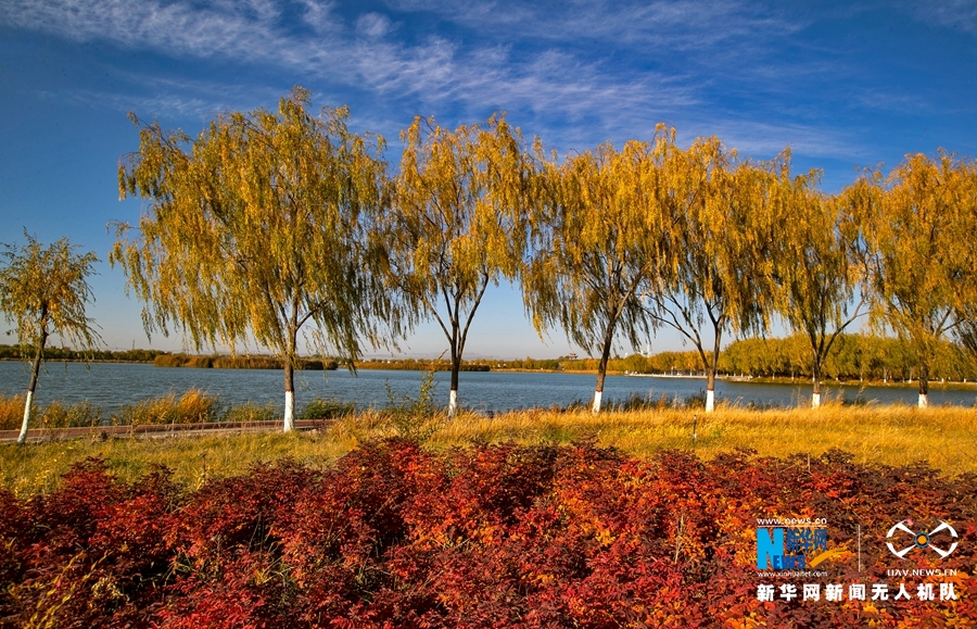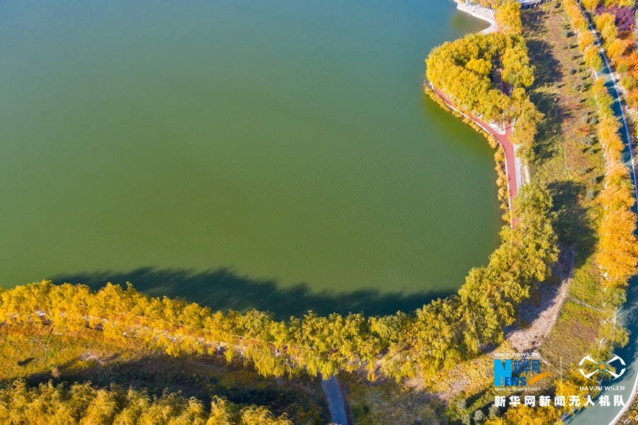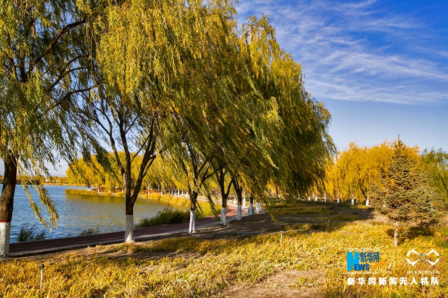 深秋時節(jié),國家4A級景區(qū)甘肅省張掖潤泉湖公園秋水依依,草木金黃,呈現出一幅斑斕畫卷。新華網發(fā)(成林 攝)