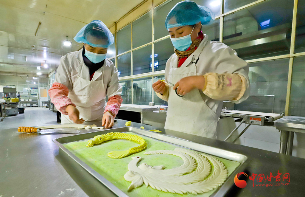 1月6日,甘肅民樂縣隴上鄉(xiāng)村農(nóng)業(yè)科技公司鄉(xiāng)村饃饃加工車間里員工正在精心制作“祥龍花饃饃”。