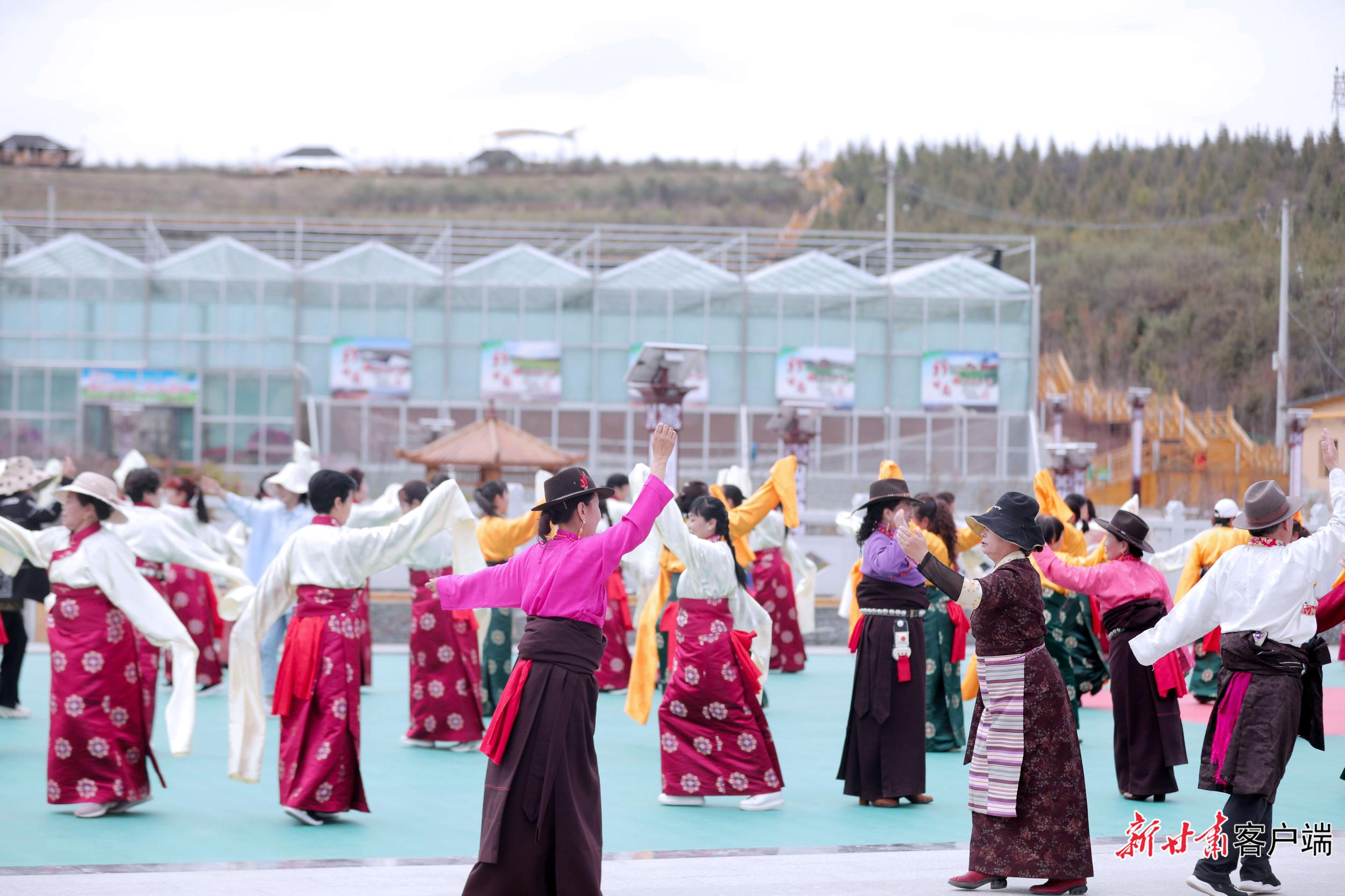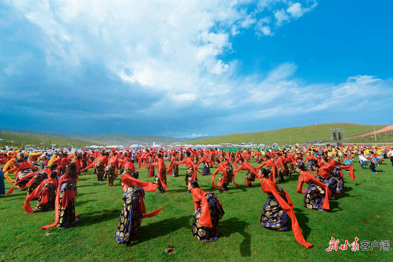 5月29日,在距離合作市區(qū)2公里處的加拉尕瑪村,隨著《吉祥甘南》優(yōu)美的旋律,游客與身著特色民族服裝的藏族兒女,和著優(yōu)美的節(jié)拍跳起了鍋莊舞。動(dòng)聽的樂曲、颯爽的舞姿、五彩的服裝,讓當(dāng)周草原陷入了一片歡樂的海洋。