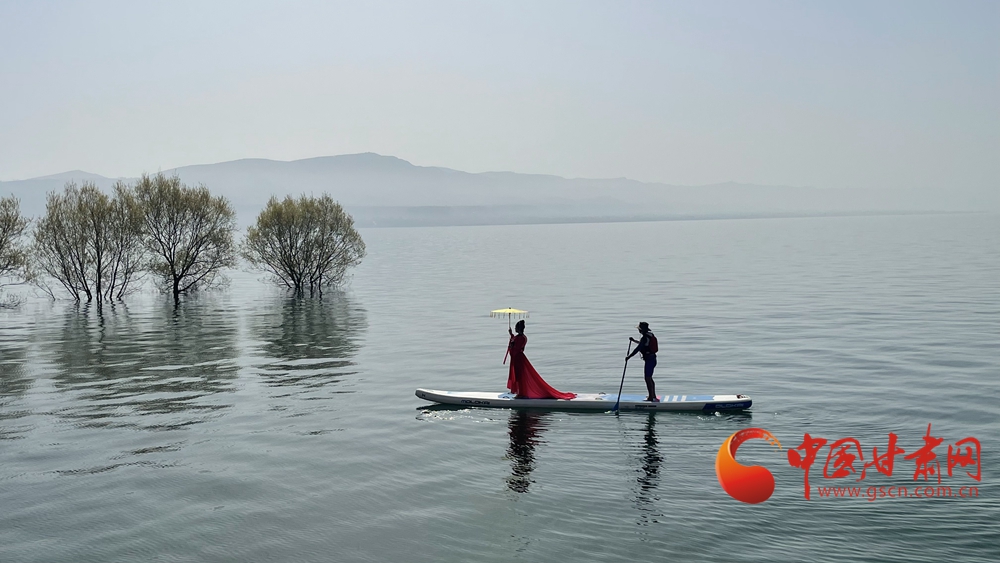 春日,炳靈湖水位上漲,碧波蕩漾,垂柳依依,槳板愛好者和游客在湖面上蕩舟嬉戲,游覽春色。
