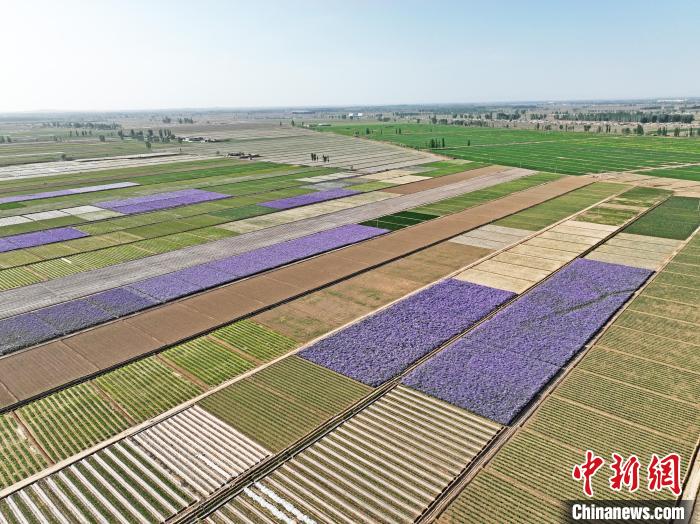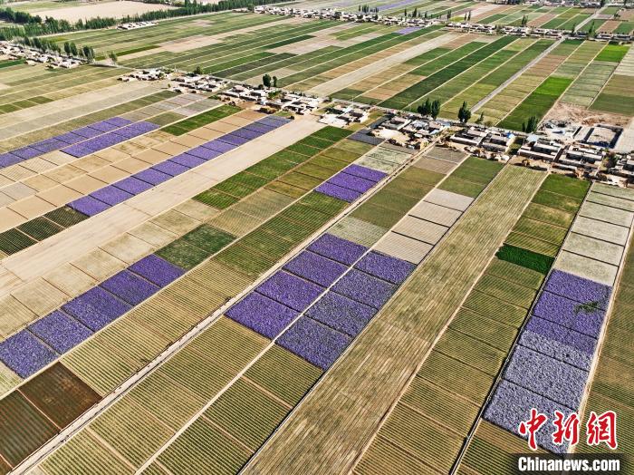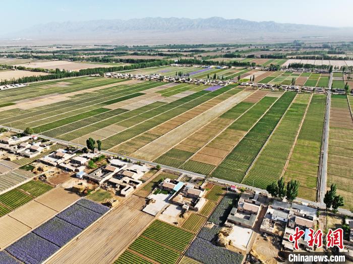 夏日時(shí)節(jié),甘肅省張掖市高臺(tái)縣駱駝城鎮(zhèn)紅新村和梧桐村的田野間,農(nóng)舍青青、遍野吐翠,阡陌縱橫間五彩斑斕,構(gòu)成一幅美麗的田園風(fēng)光畫(huà)。