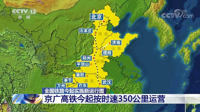 京廣高鐵從北京至武漢這一段,今天起按時速350公里運營,新型復興號智能動車組列車上線。從北京到武漢,旅行時間縮短到4小時以內(nèi)。