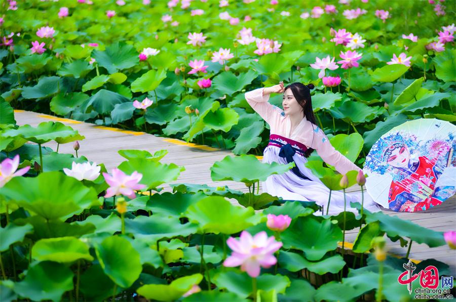 寧夏沙湖: 接天蓮葉無窮碧 國(guó)風(fēng)漢服映荷塘(圖)