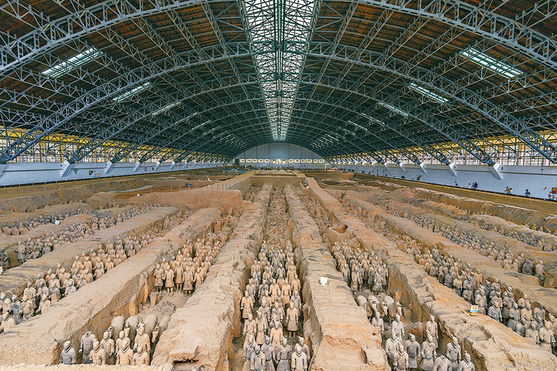 秦始皇陵是中國(guó)歷史上第一個(gè)多民族的中央集權(quán)國(guó)家的皇帝秦始皇于公元前246年至公元前208年?duì)I建的。作為秦始皇陵陪葬墓坑之一的兵馬俑坑于1974年被發(fā)現(xiàn),被譽(yù)為“世界第八大奇跡”。圖為秦始皇兵馬俑博物館一號(hào)坑全景?!∪嗣駡D片 丁俊豪/攝