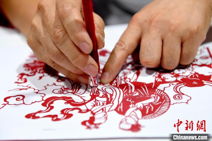 尤金水在剪刻《鵲橋相會(huì)》剪紙作品 苗鳳強(qiáng) 攝