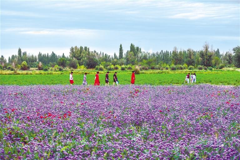 游人在敦煌月牙泉鎮(zhèn)百畝花田游覽