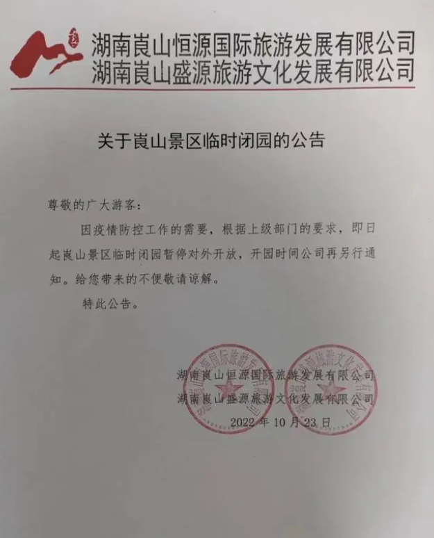 10月25日電 10月24日,崀山旅游區(qū)發(fā)布《關(guān)于崀山景區(qū)臨時(shí)閉園的公告》稱(chēng),因疫情防控工作的需要,根據(jù)上級(jí)部門(mén)的要求,10月24日起崀山景區(qū)臨時(shí)閉園,暫停對(duì)外開(kāi)放,開(kāi)園時(shí)間將另行通知。