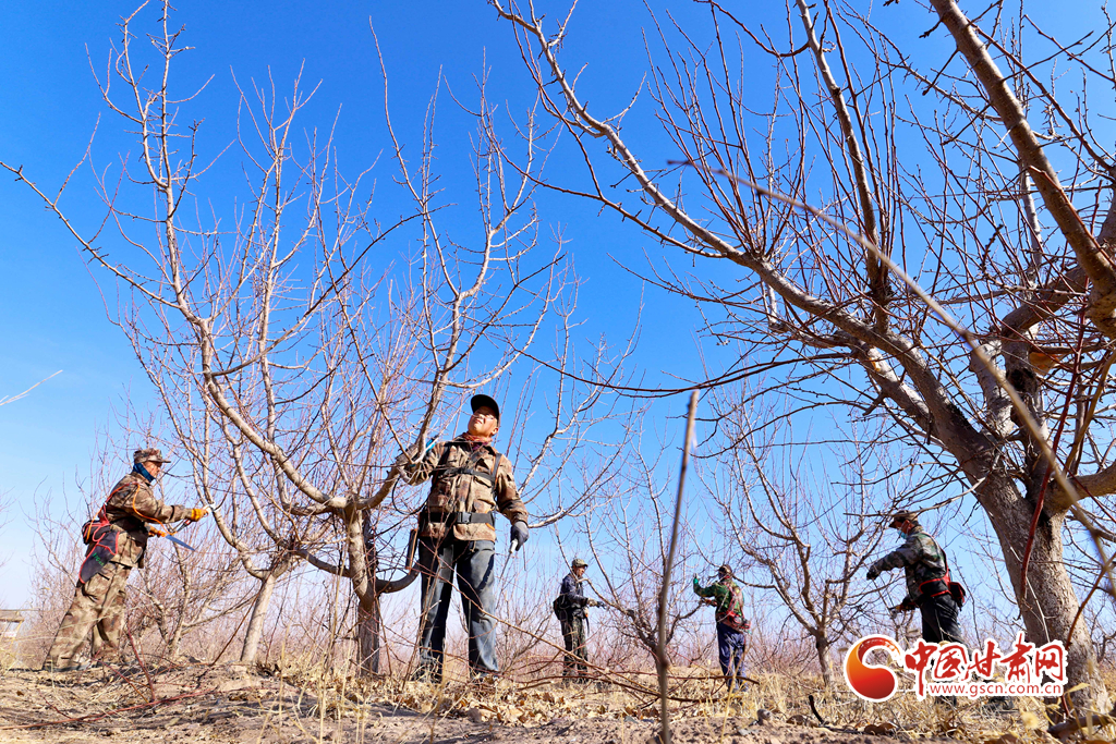 2月26日,甘肅省張掖市一3000多畝珍珠油杏種植基地上,眾多農(nóng)業(yè)技術(shù)人員正在修剪果樹的枝條。
