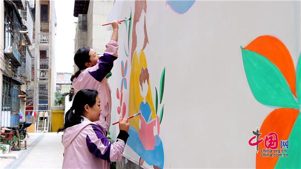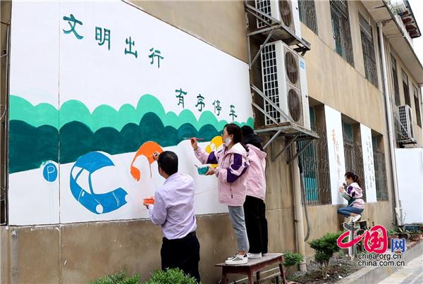 現(xiàn)場,大家手持畫筆和顏料板,相互分工協(xié)作,以墻為紙,認(rèn)真細(xì)致的設(shè)計墻繪內(nèi)容,筆起筆落間,一幅幅栩栩如生、色彩絢麗的城市文明新畫卷躍然墻上。