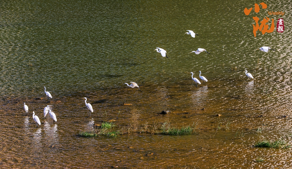 天藍(lán)、水清、田綠、樹青,成群的白鷺在子午嶺上方自由飛翔,時而在水面或河岸追逐嬉戲。