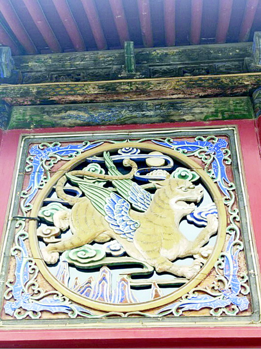 戲樓二樓為戲臺,其當心間安裝六抹活扇隔扇門,唱戲時這些門扇可以臨時取下。二樓檐下裝透雕栱間板,雕刻內(nèi)容有蓮花、牡丹、二龍捧壽等,寓意福壽連連、富貴清廉。兩盡間檻窗鏤雕翼龍、翼虎圖案。虎嘯而風生,風生而萬籟皆作,虎伏而風止,風止而萬籟皆息。而《廣雅·釋魚》中記載:“有翼曰應龍。”可見,這翼龍、翼虎暗含風調(diào)雨順的美好期盼。