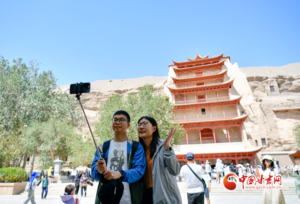 游客在莫高窟留影打卡