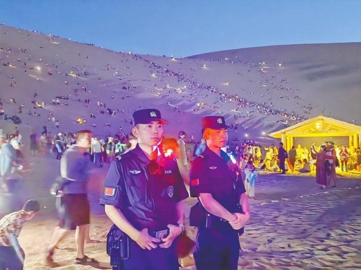 “現(xiàn)在的游客數量每天都在增長,基本上每天都有4萬多人入園。凌晨時分,鳴沙山上仍然是繁星點點、燈光閃爍,游客自發(fā)組織的演唱會讓在場的人都流連忘返。我們現(xiàn)在早上天不亮就上崗,晚上要保證每一名游客安全出園才能下班。”鳴沙山派出所所長達春平說。