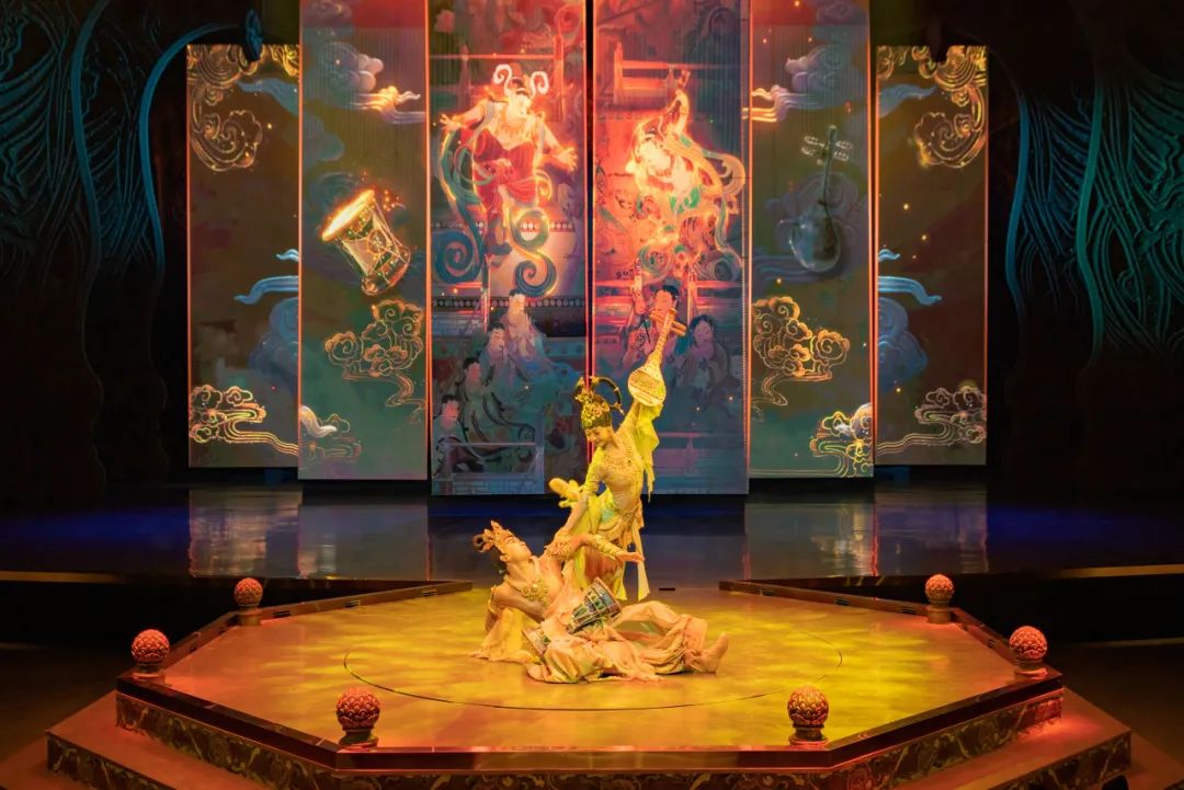 劇中運用了五弦琵琶、排簫等民族樂器及敦煌仿制樂器,演繹了胡旋舞、琵琶舞等敦煌舞蹈,配合取材自敦煌古樂譜和西域曲調(diào)的劇目樂曲,還原了敦煌壁畫中的樂舞盛景。在演出模式上,《樂動敦煌》打破了人和舞臺間的界限,讓觀眾置身劇場,近距離感受敦煌傳承千年的古樂文化魅力。
