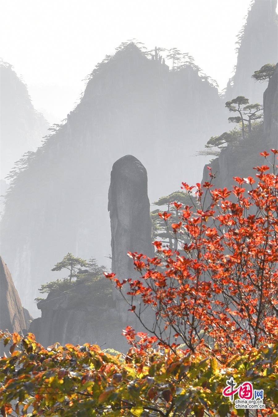 秋日黃山,雨后放晴最為嫵媚。蔚藍(lán)色的天空一塵不染,山間綿連不斷的云海,時(shí)而像海浪在空中翻滾,擁擠著、碰撞著,時(shí)而像一匹白紗綢緞,環(huán)繞在山巔上、飄散在松林間,只見(jiàn)黃山的紅葉點(diǎn)點(diǎn)散落,紅綠相間,與峻峭山峰、藍(lán)天云海、奇松怪石,精致婉約地繪成一幅幅五顏六色的山林畫卷,正是登游好時(shí)節(jié)。(姚育青)
