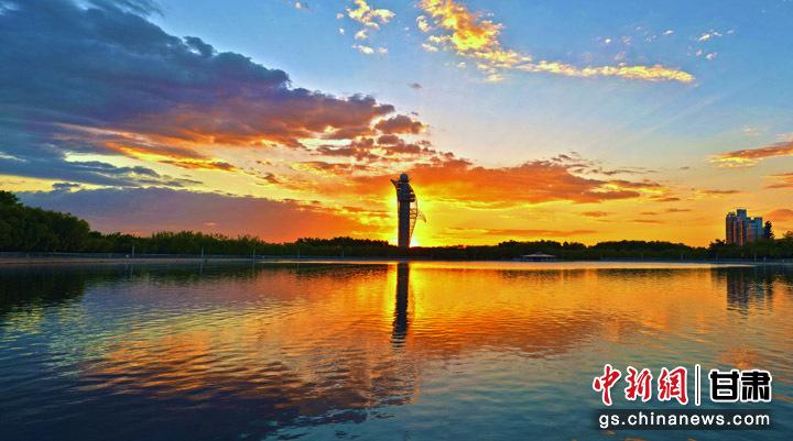 嘉峪關(guān)地標(biāo)性建筑氣象塔迎來(lái)日出。毛富 攝