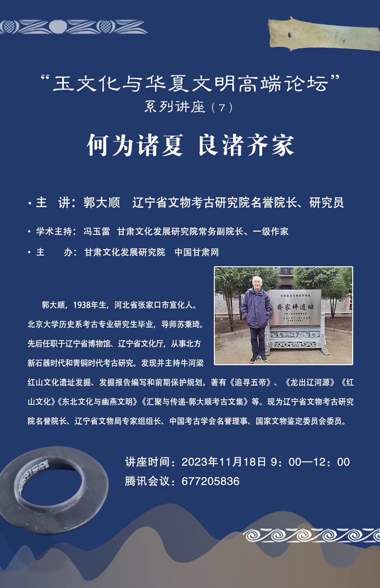 11月18日上午,遼寧省文物考古研究院名譽院長、遼寧省文物局專家組組長、中國考古學(xué)會常務(wù)理事郭大順研究員在線上做了題目《何為諸夏,良渚齊家》的學(xué)術(shù)報告。這是甘肅文化發(fā)展研究院和中國甘肅網(wǎng)聯(lián)合舉辦的“玉文化玉華夏文明高端論壇”系列講座第五講,由甘肅文化發(fā)展研究院常務(wù)院長、一級作家馮玉雷主持,西北師范大學(xué)公選課《中國玉文化》學(xué)子及鄧淑蘋、薛新明、徐琳、王方、韓斝等玉學(xué)家參會并討論。
