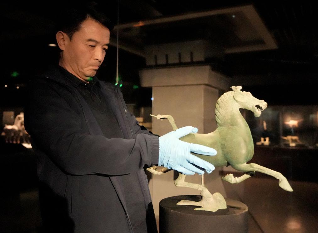 工作人員在甘肅省博物館展廳內(nèi)安放銅奔馬(2023年10月27日攝)。新華社記者 王毓國 攝