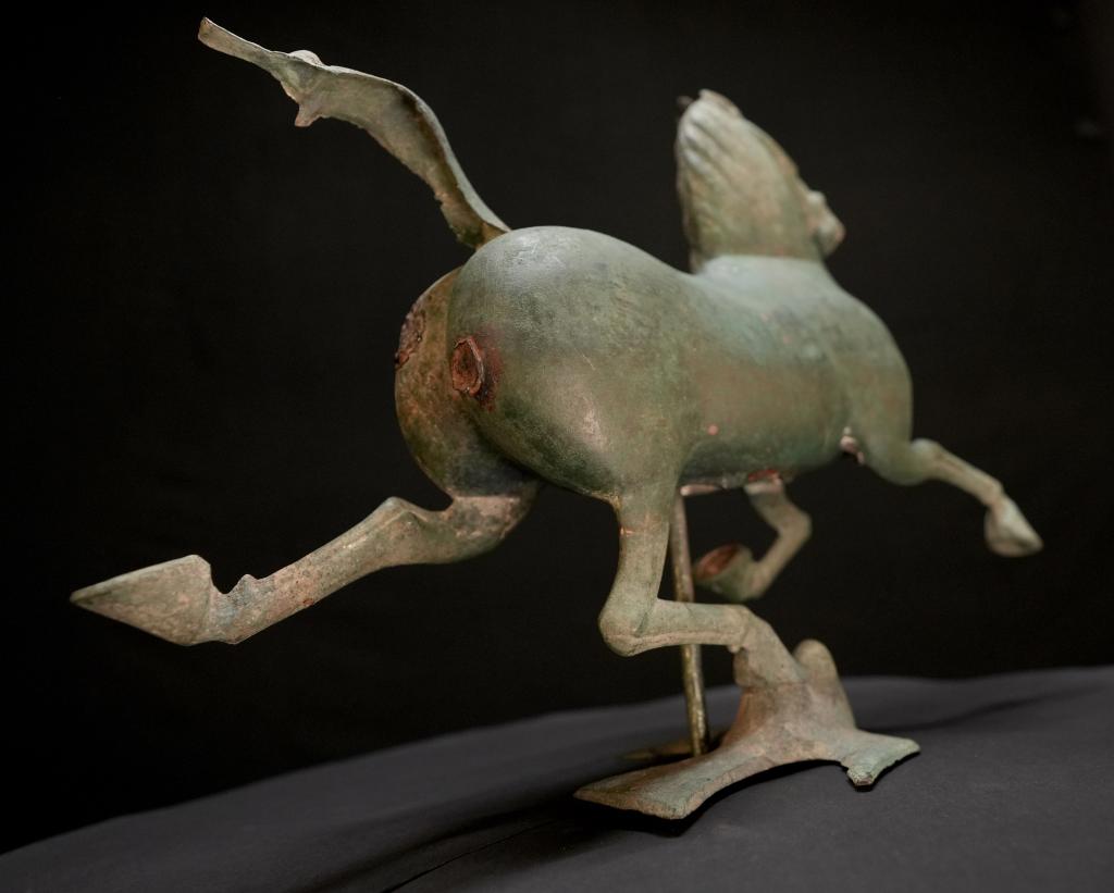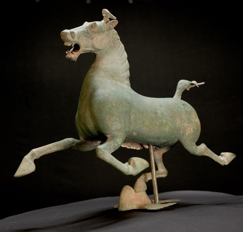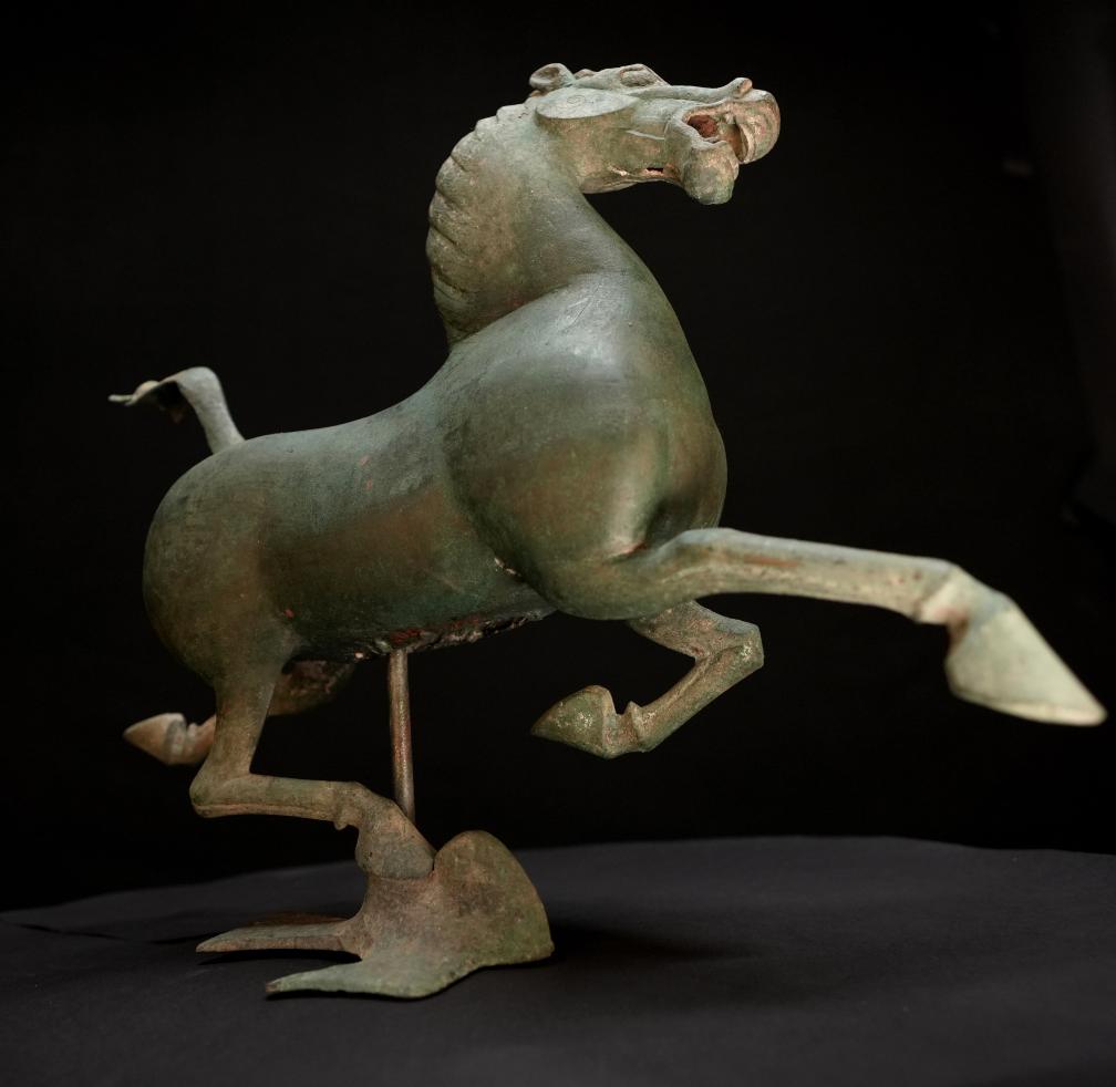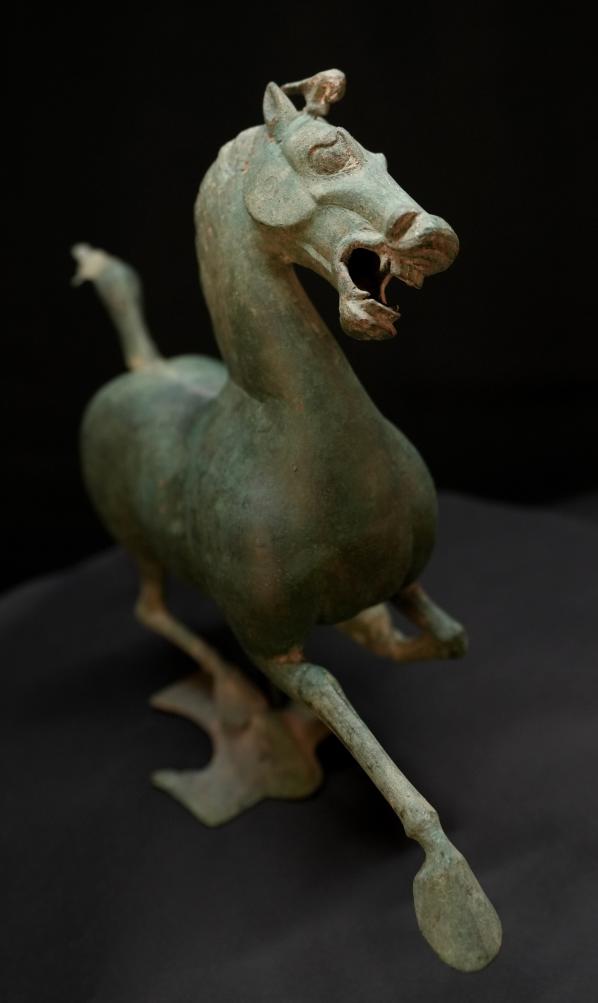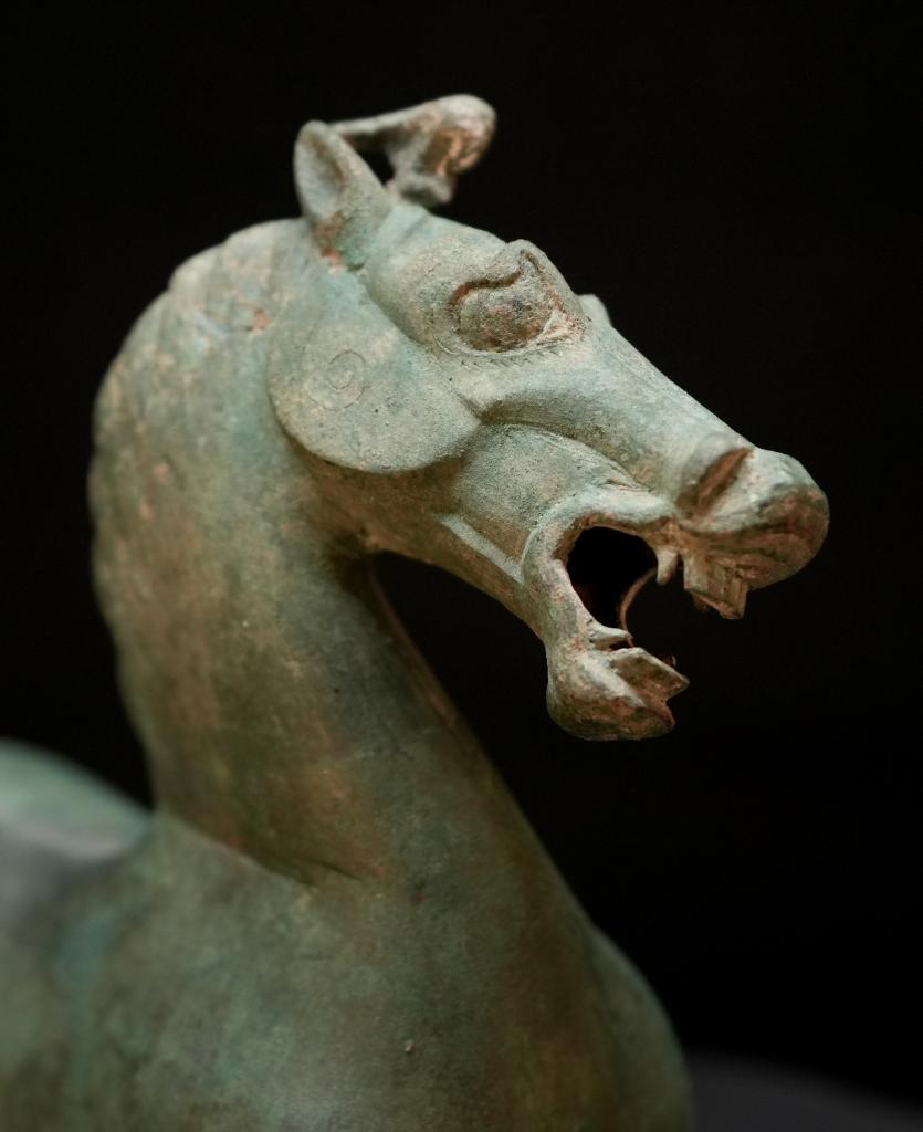 馬兒如在空中飛馳,一足踏上飛鳥的剎那,飛鳥回首驚顧。細(xì)細(xì)觀之,馬的口、眼、鼻均張開,鬃毛和尾絲后揚(yáng),令人仿若聽見馬兒奔騰的嘶鳴和風(fēng)嘯聲,靜態(tài)的青銅器充滿靈動之感。