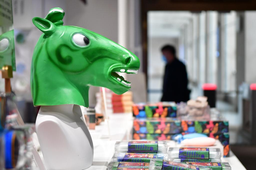 在甘肅省博物館文創(chuàng)商店拍攝的以銅奔馬為主題設(shè)計的“綠馬頭套”(2022年5月13日攝)。新華社記者 陳斌 攝