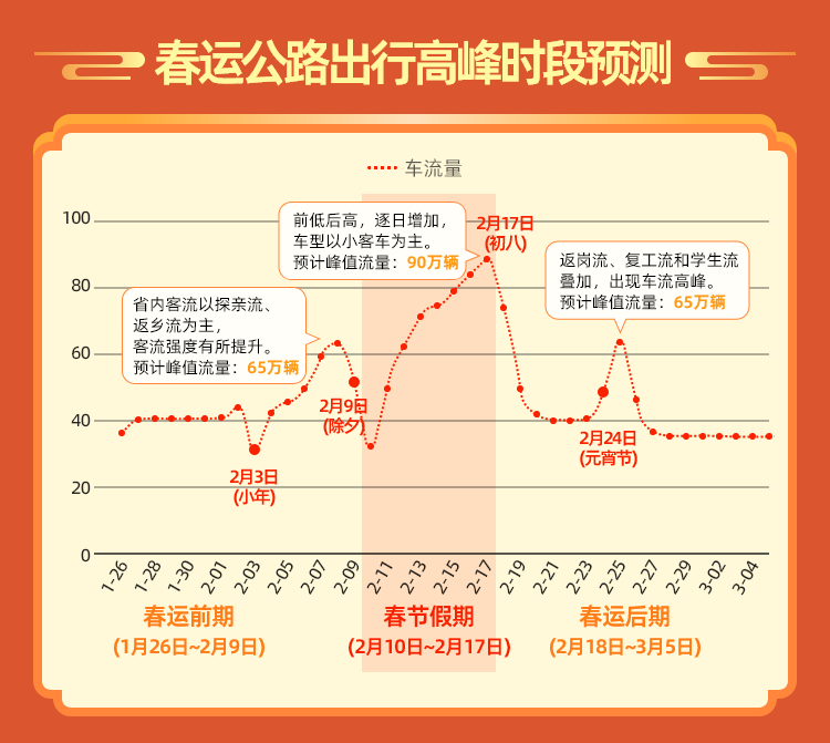 春運前期(1月26日至2月9日):省內(nèi)客流以隴南、天水、嘉峪關、武威、平?jīng)龅确较虻奶接H流、返鄉(xiāng)流為主,客流強度有所提升,跨省客流以出疆途經(jīng)甘肅返回內(nèi)地的返鄉(xiāng)流為主,出現(xiàn)節(jié)前自西向東的潮汐現(xiàn)象。預計2月8日(臘月二十九)國省道路交通流量較大,公眾出行迎來集中高峰。此外,受群眾采辦年貨、休閑逛街、中短途探親訪友以及大型活動等多種因素影響,各市城區(qū)貨物市場、繁華商圈等周邊區(qū)域以及部分主干道路,將出現(xiàn)一定的交通壓力。
