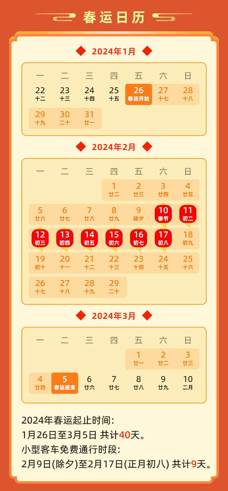 春節(jié)假期(2月10日至2月17日):預計2月10日(正月初一)車流將明顯回落,從2月11日至13日(正月初二至正月初四)拜年聚會、短途自駕出行車流較集中,出現(xiàn)短途出行小流量;2月17日假期最后一天(正月初八)出現(xiàn)返程高峰,13點至17點環(huán)蘭路網(wǎng)部分路段將出現(xiàn)區(qū)域性擁堵。