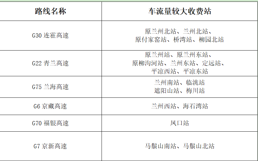 ?。ㄒ唬└咚俟分攸c路段。以蘭州為中心的放射線及其聯(lián)絡線為重點。如:G30連霍高速,G22青蘭高速,G6京藏高速,G70福銀高速,G75蘭海高速,S1機場高速等路段及相關收費站、服務區(qū)。
