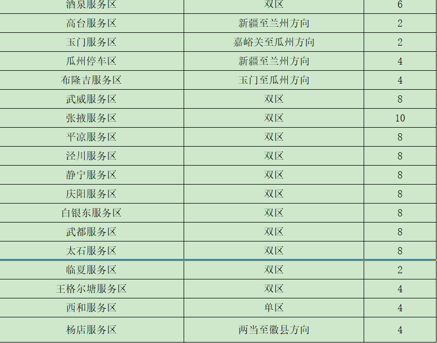 ?。ǘ┲攸c客運車站班線。省內(nèi)二級及以上客運站正常營運,以省會城市、人口密集市縣的站點及之間的班線為重點。如:蘭州客運東站、南站,天水汽車站等站點以及蘭州—定西、蘭州—西峰、臨洮—平川、舟曲—武都、金昌—武威等客運班線。 (三)車流量較大服務區(qū)。預計我省車流量較大服務區(qū)為定西服務區(qū)、酒泉服務區(qū)、武威服務區(qū)、高臺服務區(qū)、長城驛服務區(qū)、靜寧服務區(qū)、會寧服務區(qū)、太石服務區(qū)、蘭州北服務區(qū)、接駕嘴服務區(qū)、永登服務區(qū)。