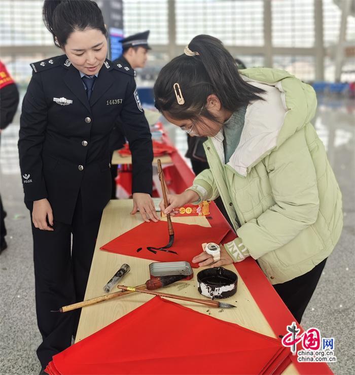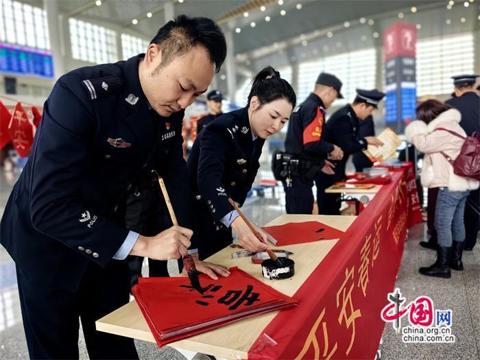 本次活動(dòng)由莆田車站派出所牽頭組織,聯(lián)合中信銀行、莆田站共同開展?;顒?dòng)期間,民警與志愿者在莆田站甬廣場(chǎng)候車室為旅客發(fā)放高鐵安全宣傳單及春聯(lián),并由青年民警現(xiàn)場(chǎng)書寫春聯(lián)、福字送給來往旅客,將平安、溫馨傳遞給每一個(gè)人。