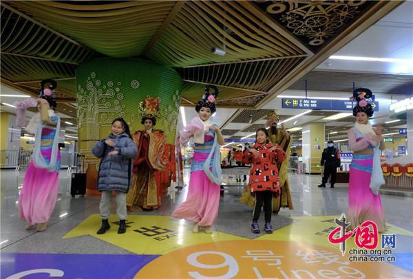 2020年底,西安地鐵9號(hào)線開通之際,華清池站帝妃攜仕女表演的《霓裳羽衣舞》,秦王攜眾臣高呼“我們有地鐵了”的聲音依舊回旋耳邊。時(shí)值龍年新春佳節(jié),廣大乘客在乘坐安全舒適西安地鐵9號(hào)線的同時(shí),將再次有機(jī)會(huì)在地鐵車站和地鐵列車上來(lái)一場(chǎng)“秦唐”文化的穿越之旅。