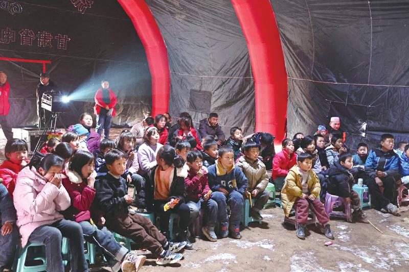 冬日的嚴寒擋不住震區(qū)群眾的觀影熱情。帳篷內,電影《英雄若蘭》《新神榜:楊戩》先后放映,孩子們分排而坐,被影片生動有趣、跌宕起伏的情節(jié)深深吸引,不時傳出歡聲笑語。“志愿者給我們放電影,豐富了我們的文化生活。”正在觀影的村民呂鵬說。