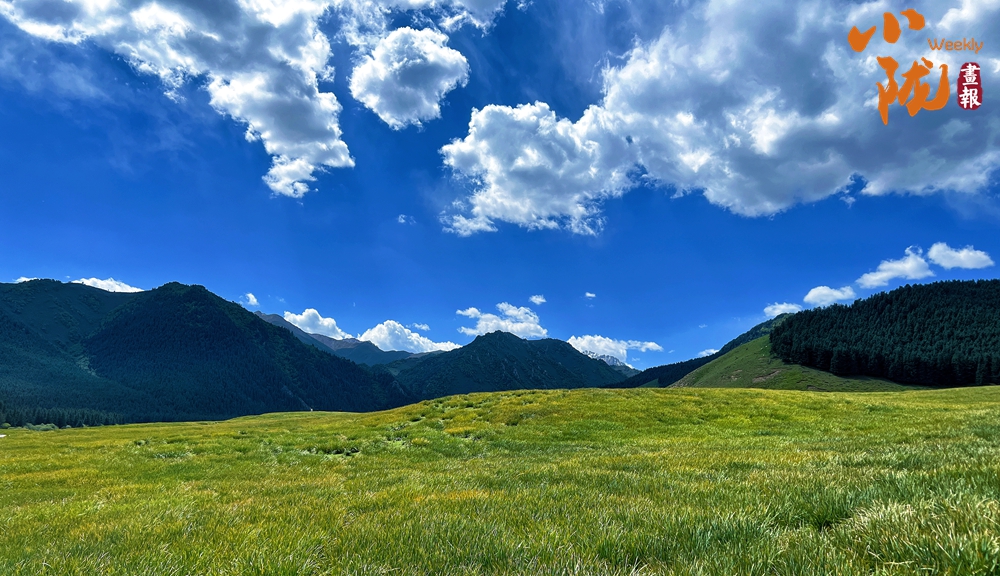一片碧綠的草地,一望無際,像一片綠色的地毯鋪向遠方,伴著藍天白云和遠處森林、群山,構(gòu)成了一幅美麗的風(fēng)景畫。