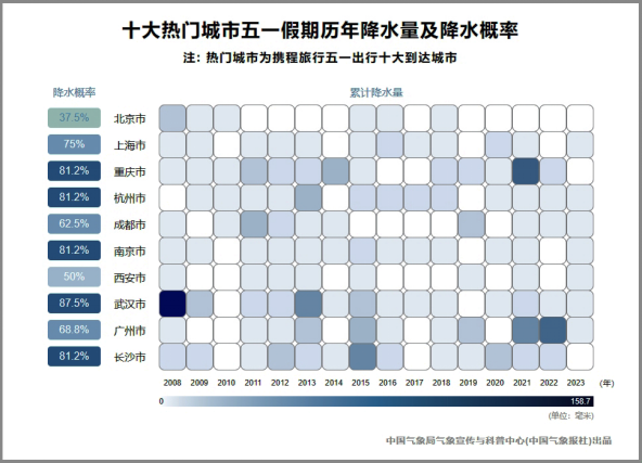 我們選取了攜程旅行公布的五一假期十大熱門(mén)旅游目的地,來(lái)看看自2008年以來(lái),熱門(mén)出行城市下雨的概率有多少?降水量大不大?
