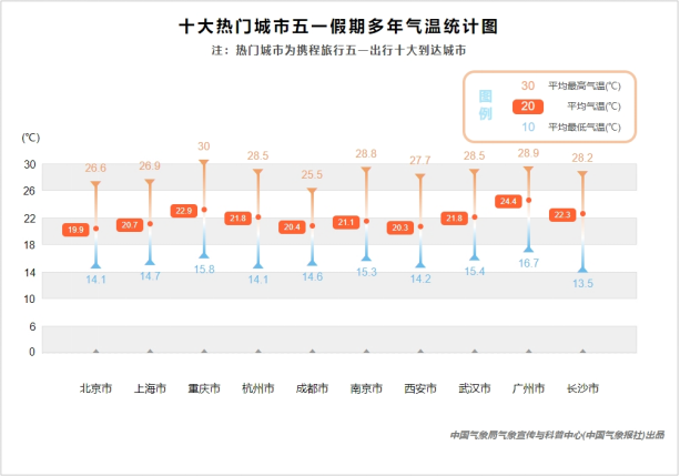 熱門(mén)城市中,北京5月1日至4日以晴為主,最高氣溫在26℃至28℃,適宜出行游玩,5日預(yù)計(jì)將出現(xiàn)小雨,氣溫略有下降。西安則在4日會(huì)出現(xiàn)小雨,其他時(shí)間以多云和陰天為主,氣溫在23℃上下,非常適宜出行。位于中東部地區(qū)的上海、杭州、南京等熱門(mén)城市5月1日-3日均以多云和陰天為主,最高氣溫均在20℃左右,溫度適宜,4至5日將出現(xiàn)小雨,出行還需注意做好防雨準(zhǔn)備。長(zhǎng)沙和武漢3日至4日將出現(xiàn)中雨至大雨天氣,不適宜戶(hù)外游玩。位于西南地區(qū)的成都和重慶“五一”假期前四天都將被小雨籠罩,直到5日才會(huì)放晴。