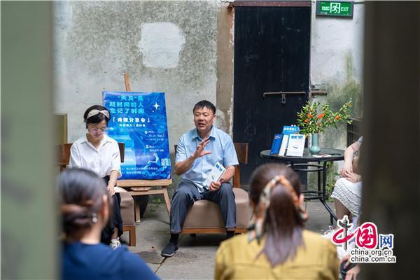 在書院小院里,一位腳穿布鞋,親切隨和,滿臉笑容的男士正在分享,從《趕時間的人》創(chuàng)作心得,到新書《低處飛行》作品朗誦和創(chuàng)作故事點滴,還有撿破爛、送外賣的人生經(jīng)歷,深情的講述,傳遞的是始終不曾改變的對寫詩的執(zhí)著與熱愛。