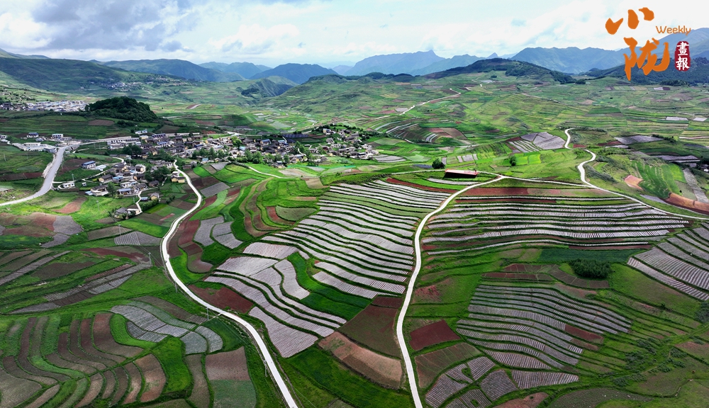 從空中俯瞰,阡陌縱橫與遠處連綿起伏的青山,錯落有致的民居交相呼應,勾勒出一幅美麗的“田園畫卷”。