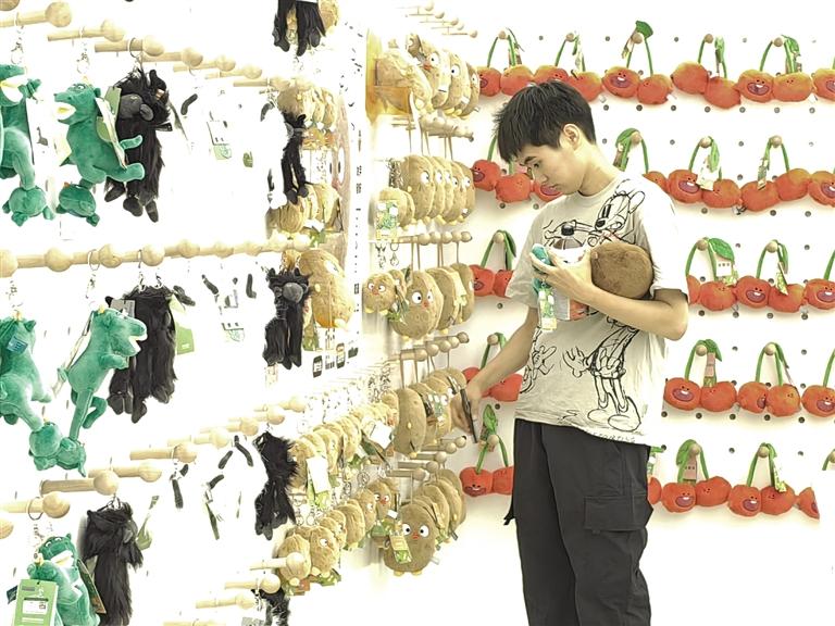 此時(shí),目不暇接的花式文創(chuàng)在店內(nèi)“爭(zhēng)奇斗艷”,爭(zhēng)當(dāng)“顯眼包”,等待被主人帶回家。掀開店內(nèi)一只毛絨收納箱,一窩土豆子撲閃著大眼睛向你眨眼。都說(shuō)轉(zhuǎn)角遇到愛,誰(shuí)料,轉(zhuǎn)角處粉嘟嘟的“拿捏玩偶娃娃公仔”捏著一個(gè)小蓮花花苞在向你招手。一回頭,造型別致的文創(chuàng)飾品精美又時(shí)尚,一側(cè)的帆布包上印著“別卷我”。就連記者逛下來(lái),都入手兩件文創(chuàng)。