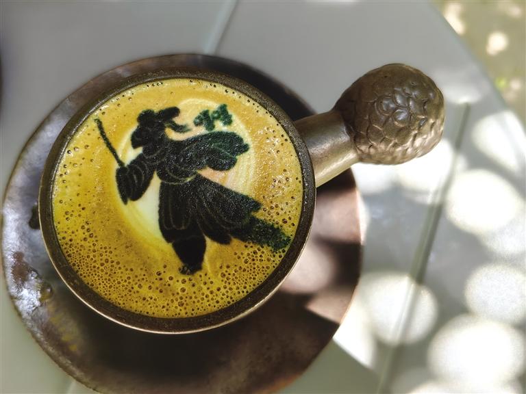 驚喜還有很多,就像店內(nèi)柜體上的一句話“可以讓大家體會(huì)到我們不一樣的用心”,這些年輕人用心起來(lái)還真能撬動(dòng)地球。飲品和咖啡,設(shè)計(jì)團(tuán)隊(duì)愣是把口味和地域文化結(jié)合起來(lái),整出了幾款“限量版”:城市限定——沙橙暴飲品,西北特有;特調(diào)咖啡——苦水玫瑰特調(diào),讓人一口難忘之余還配上了臺(tái)詞,“苦水玫瑰有點(diǎn)甜”;“文物咖啡”更是占據(jù)“C位”,咖啡拉花機(jī)“印制”而成的微縮版銅奔馬、蛙紋罐、銅車馬等文物圖案浮在濃郁的咖啡上,精致、唯美。這還不算,咖啡器皿的名稱也非同尋常——鷹首權(quán)杖杯。陶瓷來(lái)自景德鎮(zhèn),手柄是省博鷹頭形青銅權(quán)杖首的文物原型。驚嘆、贊美、感慨,每一位品嘗之人喜愛之余竟不忍飲用。